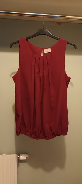 Mörkt Vinröd, ärmlös blus med rund halsringning och plissering framtill. Blusen har en resår nedtill. Plagget har en mörkare färg i verkligheten.