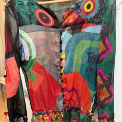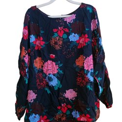 Färgglad blus med fjärilsmönster. Den har en V-ringning med dragkedja framtill och öppna axlar.