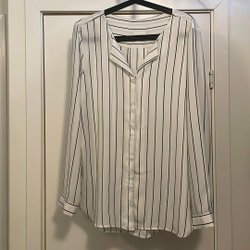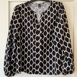 Vit blus med ett svart prickigt mönster. Blusen har puffärmar och en hög hals.