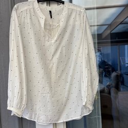 Elegant, benvit blus med långa ärmar och en unik design. Blusen har en knappstängning fram och fina plisseringar baktill, vilket ger en sofistikerad touch.