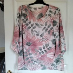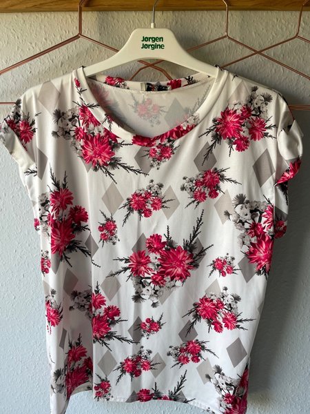 Fin bluse med blomsterprint i hvide, grå og pink nuancer. Blusen har korte ærmer med opsmøg og en rund halsudskæring.