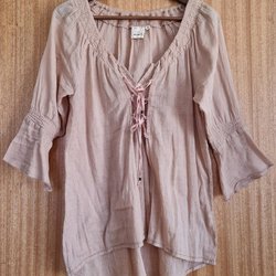 Mörkblå blus med ett blommigt mönster i rosa och vitt. Blusen har långa ärmar med spetsdetaljer vid ärmsluten. Den har en rund halsringning och stängs med en knapp i nacken.