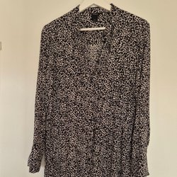Gul blus med ett blommigt mönster i svart, vitt och rosa. Blusen har en V-ringning och ärmar med volanger vid handlederna, kantade med en svart linje.