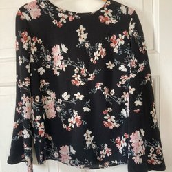 Svart omlottblus med långa ärmar och ett blommigt mönster i vitt och gula detaljer. Blusen har en smickrande passform och knyts i sidan.