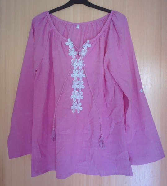 Rosa blus med lång ärm och broderade vita blommor framtill. Blusen har en avslappnad passform och en rund halsringning med knytband.