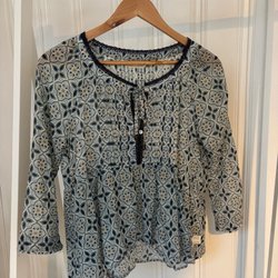Vit blus med långa ärmar och detaljerade broderier i blått och persikofärgat över bröstet. Blusen har en V-ringning med knytband och en smockad midja baktill. Ärmsluten är prydda med en liten rosett och har en virkad kant i mörkblått, vilket även återfinns runt halsringningen.