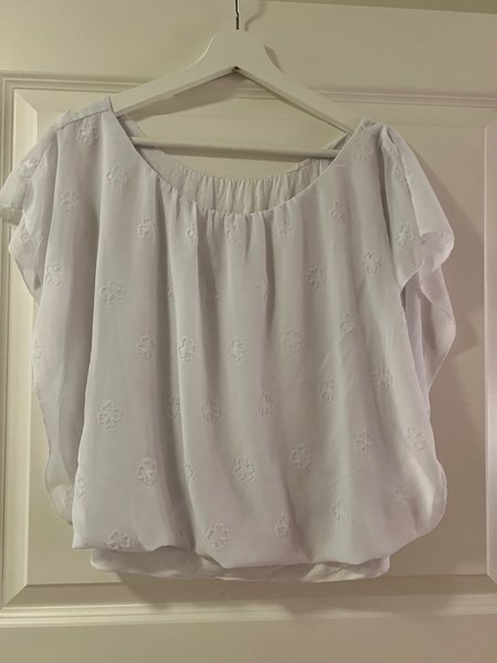 Vit blus med korta ärmar och ett mönster av små blommor över hela tyget. Blusen har en rundad halsringning med resår och en resårmudd nedtill som skapar en puffig silhuett.