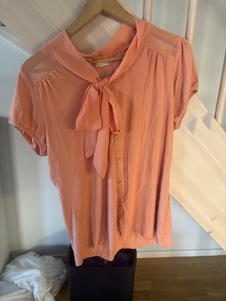 En persikofärgad blus med korta ärmar och en knytrosett vid halsen. Blusen har knappar framtill och en lätt, luftig design.