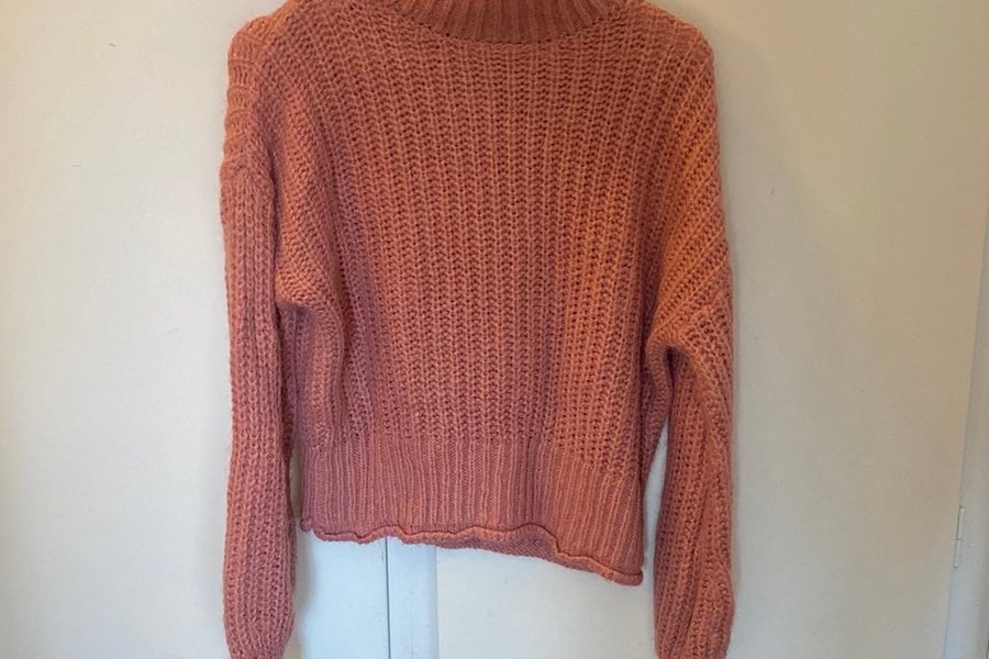 Stickad tröja i en korallrosa färg med hög krage och långa ärmar. Tröjan har en avslappnad passform.