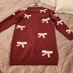 Vinröd tröja med en vit skjortinsats nedtill. Tröjan har en rund halsringning och långa ärmar.