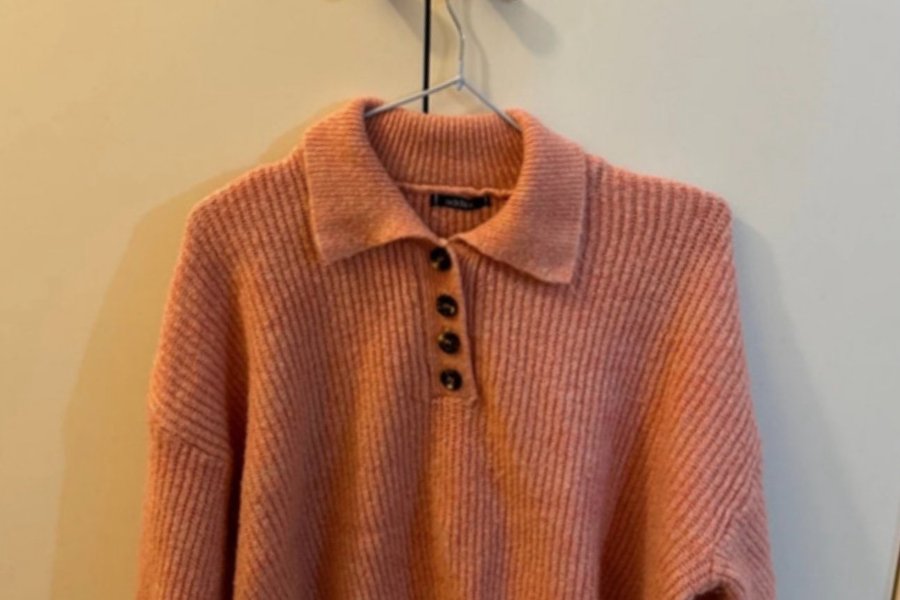 Rosa stickad tröja med krage och knappar. Tröjan har en avslappnad passform och långa ärmar.