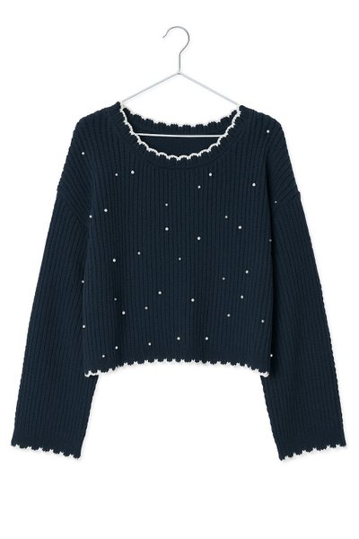 Mörkblå stickad tröja med långa ärmar. Tröjan har en rund halsringning och är dekorerad med små pärlor. Detaljer med en vågig kant vid halsringningen och nederkanten av tröjan och ärmarna.