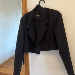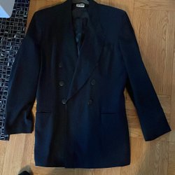 Klassisk svart kavaj med dubbelknäppning och fickor fram. Perfekt för en formell eller avslappnad look.