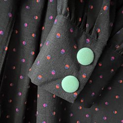 Svart kavaj med en knapp framtill och tre knappar vid ärmslut. Två snedställda fickor med lock, bröstficka och innerficka.