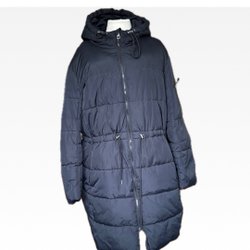 En elegant, mörk kappa med ett subtilt mönster. Den har en hög krage och knappar framtill, samt praktiska fickor. En dekorativ blomma pryder ena sidan av bröstet, och detaljer i avvikande färg finns vid ärmslut och nederkant. Sparsamt använd, katt o hund finns i hemmet. Väldigt fin ull, ofodrad, mjuk och töjbar.