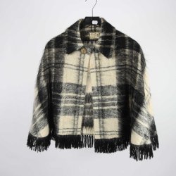 Elegant svart fuskpälscape med grå detaljer vid ärmslut och nederkant. Jackan har en vacker spänne vid halsen som ger en extra touch av glamour. Perfekt för att hålla värmen med stil under kyliga dagar.