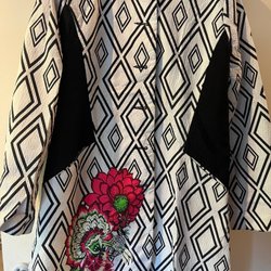 Vit kappa med knytskärp i midjan. Kappan har en öppen design framtill och långa ärmar. Den har en rak passform som kan justeras med det medföljande skärpet.