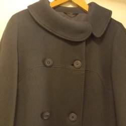 En grå kappa med knytskärp i midjan och slagkrage. Kappan har två fickor framtill.