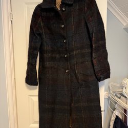 Vändbar quiltad kappa med två fickor. Ena sidan har ett mönster med granatäpplen i rött och vitt mot en svart bakgrund, med röda detaljer. Den andra sidan har ett svartvitt mönster med röda detaljer. En knapp saknas annars nyskick