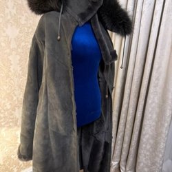Pälsen har en klassisk krage och en rak, lång modell. Perfekt för att hålla värmen med stil.