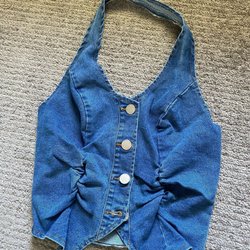 Vit jeansjacka med knappar och fickor. Jackan är kort i modellen och passar bra till ett par shorts eller en kjol.