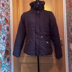 Grå jacka med svart fuskpälsdetaljer. Jackan har en dragkedja fram och en hög krage. Den har en figurnära passform och går ner till mitten av låret.