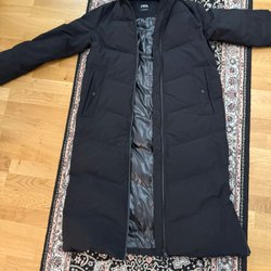 Svart, lång pufferjacka med huva från Zara. Jackan har fickor fram.