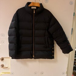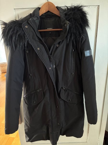 Dunjacka från Rock and blue. Passform till mitt på låret. Avtagbar fuskpäls på luvan. Mkt bra passform.
