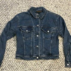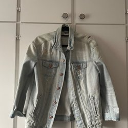 Oversized jeansjacka med lite puffärmar. Väldigt sparsamt använd. Jag är storlek M-L och kan ha denna trots att den är i storlek S.