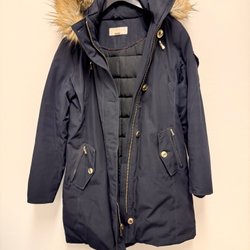 Mörkblå vinterjacka med huva och fickor framtill. Jackan har en rak passform och stängs med knappar och dragkedja.