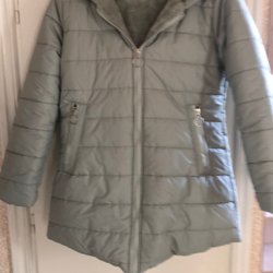 Grå, fluffig jacka som endast är använd en gång.