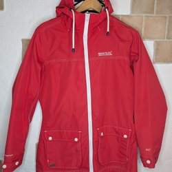 Röd jacka med svarta detaljer. Färgen drar lätt åt cerise, snarare än åt klarrött.