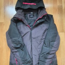 Svart jacka med huva och dragkedja framtill.rosa detaljer ,Jackan har två fickor med dragkedja på sidorna. Det finns en liten logga på vänster bröst och en större logga på baksidan av jackan.
