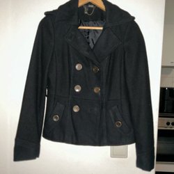 Svart jacka med huva och dragkedja framtill. dragsko i midjan för justerbar passform och två fickor fram med lock och tryckknappar samt två sned fickor högre upp . Ärmsluten är raka och jackan har en quiltad insida, bra mellansäsongs jacka!