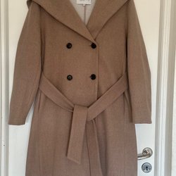 En rosa jacka med huva och vit fuskpäls runt kragen. Jackan har en dragkedja framtill och två fickor. Ärmarna har dekorativa snörningar med vita band och metallöljetter. Midjan och ärmsluten är elastiska.