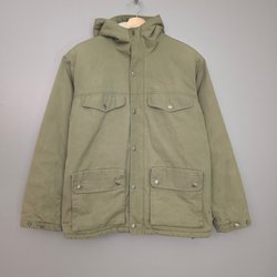 Brun, vadderad jacka med huva. Jackan har dragkedja fram, två fickor nedtill och en justerbar rem i midjan.
