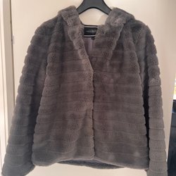 Grå jacka med brun fuskpäls krage och muddar. Jackan har knappar fram.
