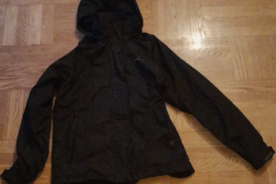 Svart jacka med huva och dragkedja. Jackan har långa ärmar och fickor med dragkedja. Regnjacka.