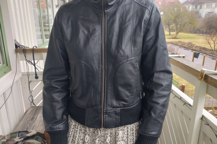 Läderjacka med dragkedja framtill. Jackan har en hög krage och ribbade muddar i ärmslut och nederkant. Det finns fickor med dragkedja på sidorna.