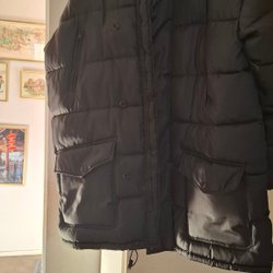 Svart jacka med dragkedja och fickor fram. Jackan har en stor huva med fuskpäls.