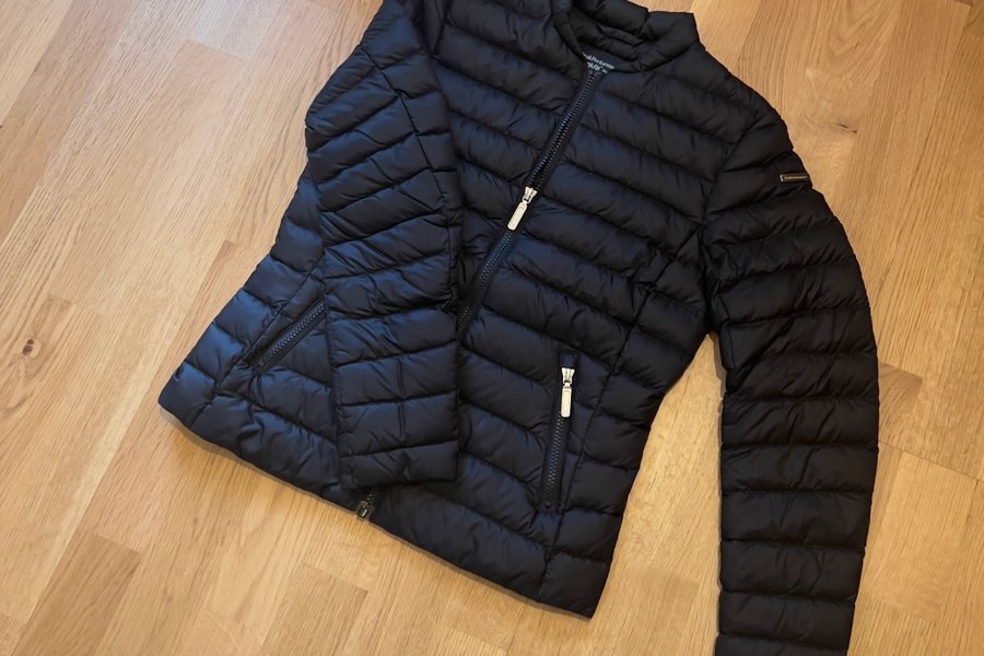 Svart jacka med dragkedja och fickor med dragkedja fram. Jackan har en liten logotyp på ena ärmen.