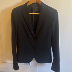 klassisk krage och en enkel knäppning framtill. Jackan har en strukturerad yta och två fickor framtill. Ärmarna är långa och raka, vilket ger en stilren silhuett.