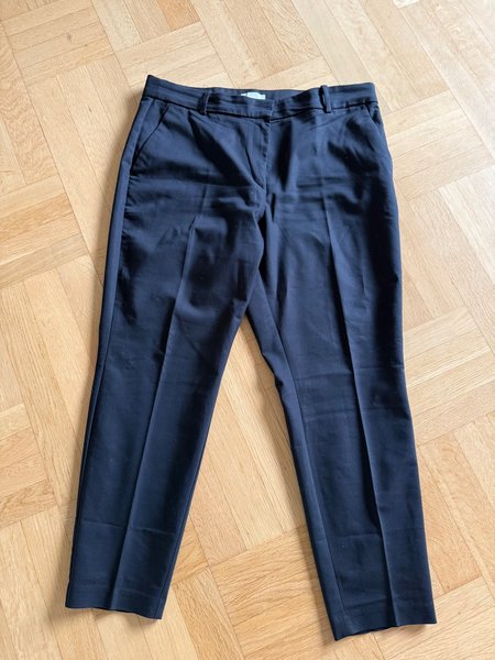 Svart kostymbyxa med pressveck framtill. Byxorna har fickor i sidorna och hällor för skärp i midjan.