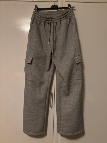 Mörk grå, L , ben inner längd 72 cm. , djupa sid fickor, bra ben fickor, lite tjockare material , dragsko i midjan