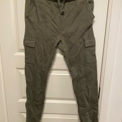 Grå cargobyxor i en mjukisbyxmodell med två fickor på varsin byxben. Mjukisbyxorna har en elastisk midja och muddar vid anklarna. I storlek XL.
