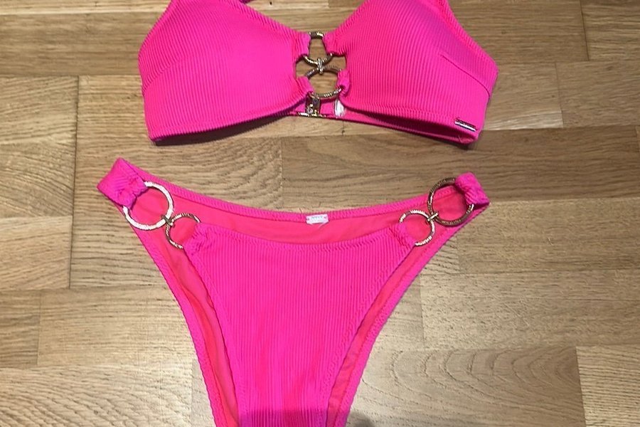 Rosa bikini med ribbad textur. Bikinitoppen har en dekorativ detalj i mitten med sammanlänkade ringar. Bikiniunderdelen har liknande ringdetaljer på sidorna.