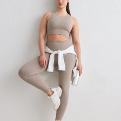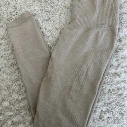 Ett par ribbade leggings med hög midja. Lite noppriga på rumpan och loggan har lossnat i en söm.