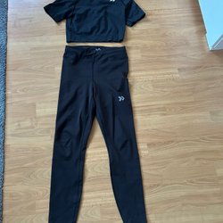 Grå tränings t-shirt i storlek XS med korta blå träningsshorts i storlek S. Seamless material.