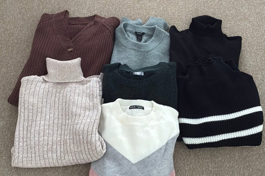 Här är ett paket med olika tröjor. Det finns en brun cardigan, en beige polotröja, en svart tröja med vita ränder, en svart tröja med krås, en grå tröja och en tröja med färgblock i rosa, grått och vitt.