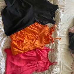 Ett paket med tre klänningar. En brun långklänning med smala axelband, en ljusrosa klänning med paljetter (trasig dragkedja) och en beige klänning med dragkedja fram.